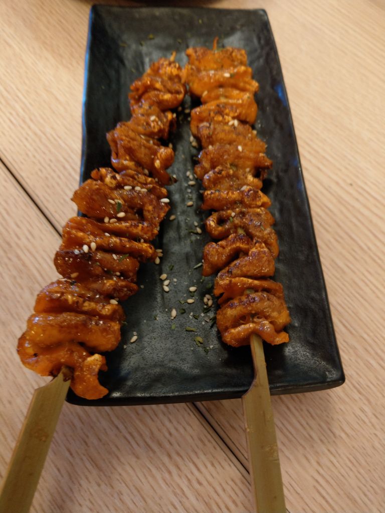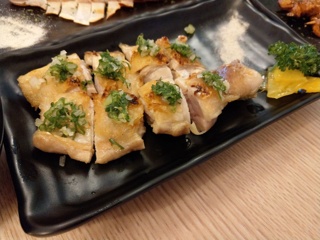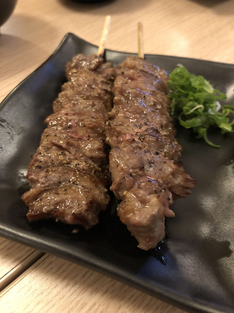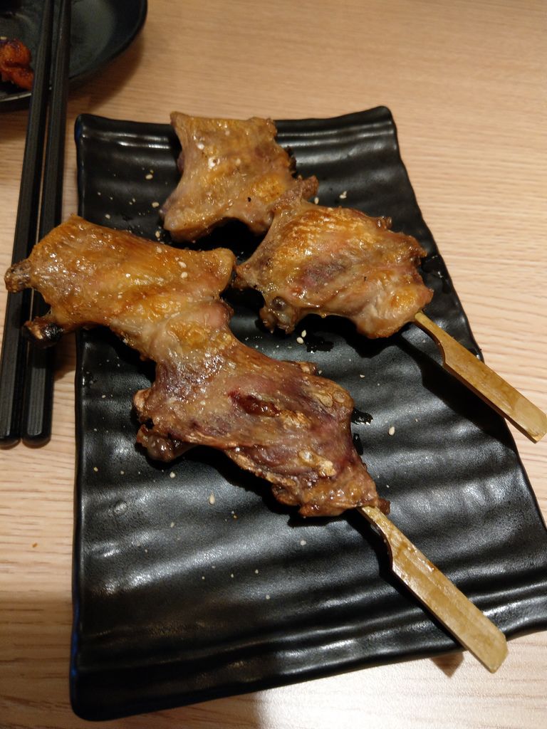 雞皮是燒烤常見的菜色,雞皮的處理十分的乾淨。脆脆的雞皮搭配著烤肉醬,這就是雞皮串燒該有的態度。