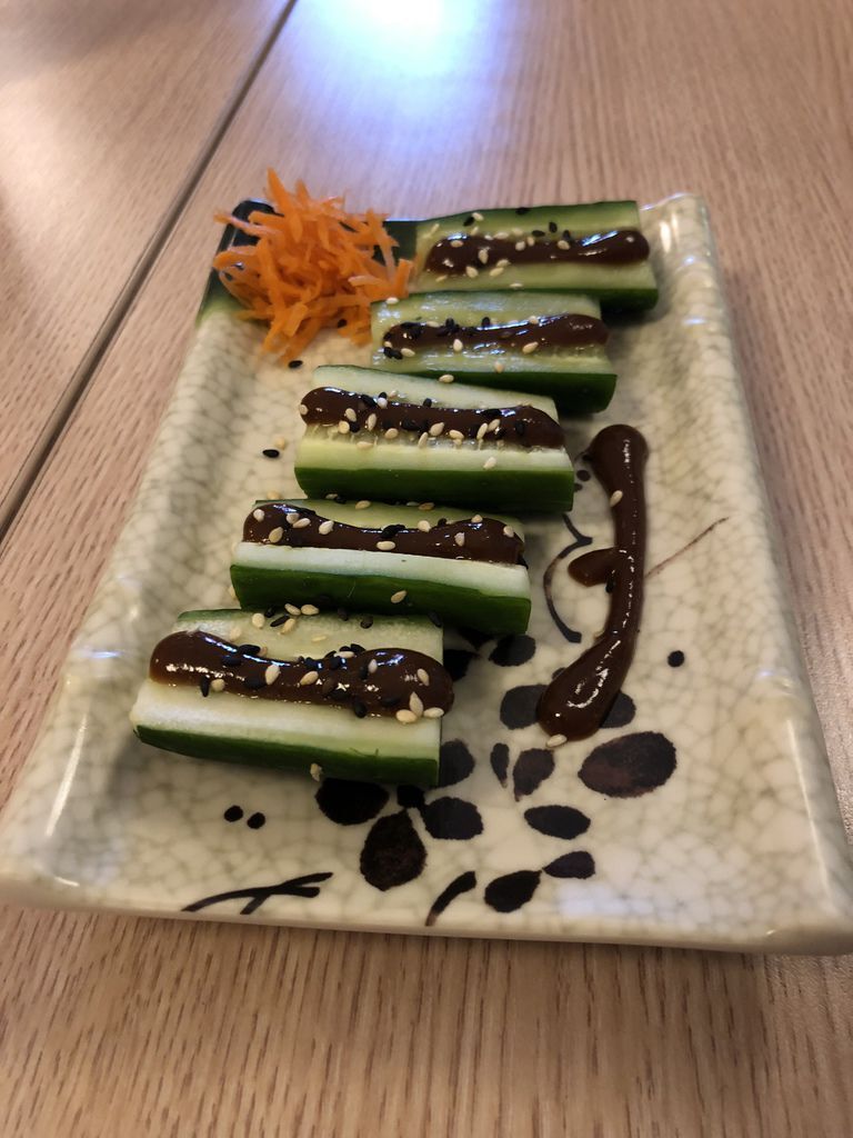 小黃瓜總是帶有一點瓜類的腥味,通常都要刨絲或切片,才能降低腥味好入口。店家剛送上來時,對小黃瓜的刻板印象,讓我不免懷疑,塊狀的小黃瓜不會有腥味嗎!但點了就要試試看呀!吃一口後,覺得改觀了,小黃瓜搭配著店家特調味噌醬,在嘴裡,只吃到小黃瓜的鮮甜口感,鹹甜味噌沙拉簡直是加分,原來小黃瓜跟味噌是十分麻吉的朋友。