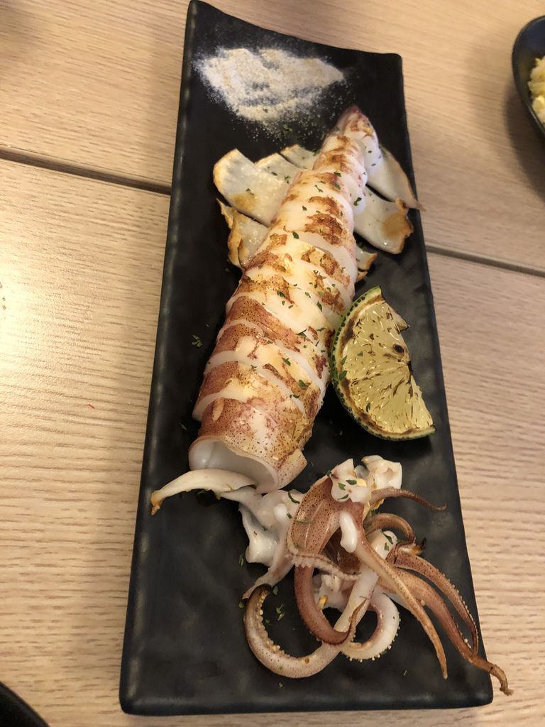 「筑安心串燒·居酒屋」對自己的食材新鮮度可是十分有信心。不同於外面燒烤所販賣的小卷塗滿烤肉醬,這中卷只經過燒烤就端上桌,只佐簡單的胡椒粉及檸檬汁,就是要你吃這中卷的鮮甜。