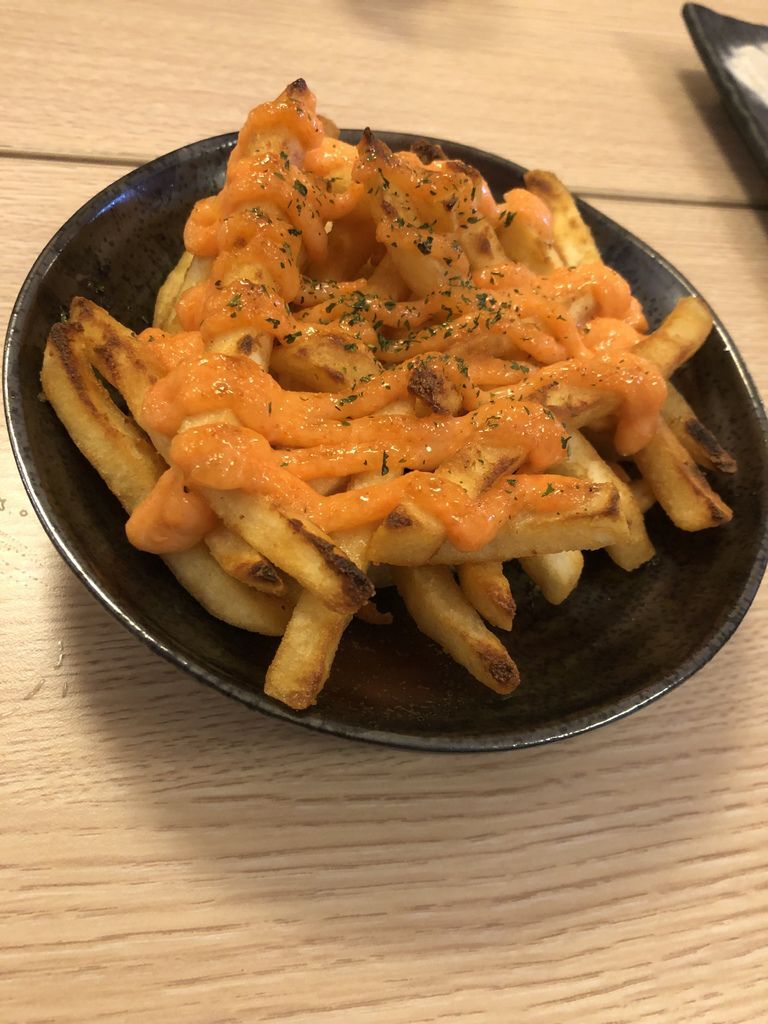 店家巧思以明太子沙拉取代番茄醬搭配著炸的酥酥且金黃色的薯條,可是小朋友的最愛,簡直是秒殺。