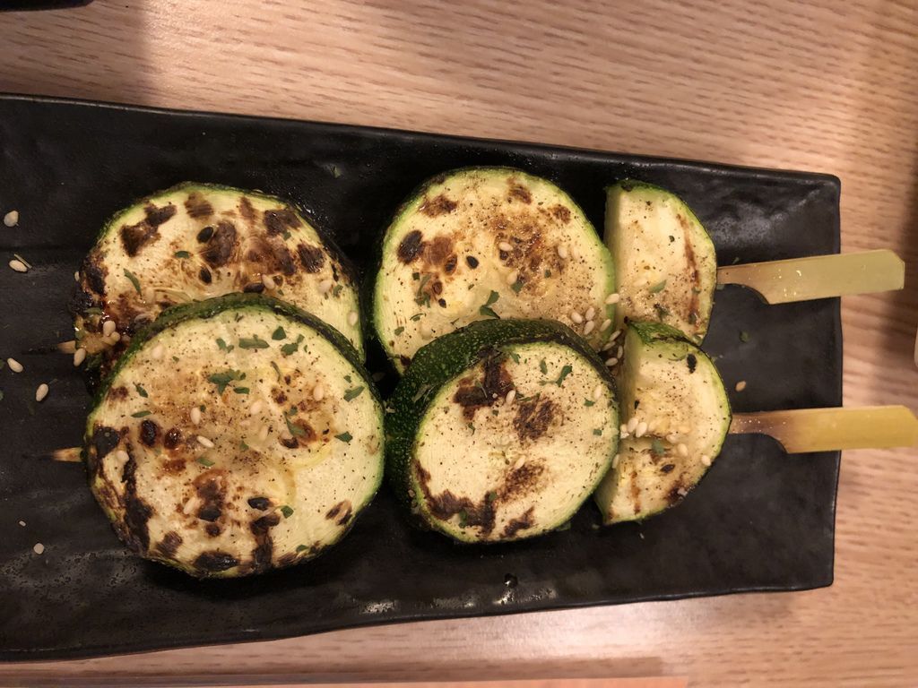 烤肉常常出現的蔬菜不外乎是玉米、青椒,這櫛瓜還是我第一次看到的蔬菜。透過烤的方式,將櫛瓜的水分鎖在裡面,一口咬下嚐到的是蔬菜甜味及櫛瓜的多汁,這道菜非常推薦給大家。