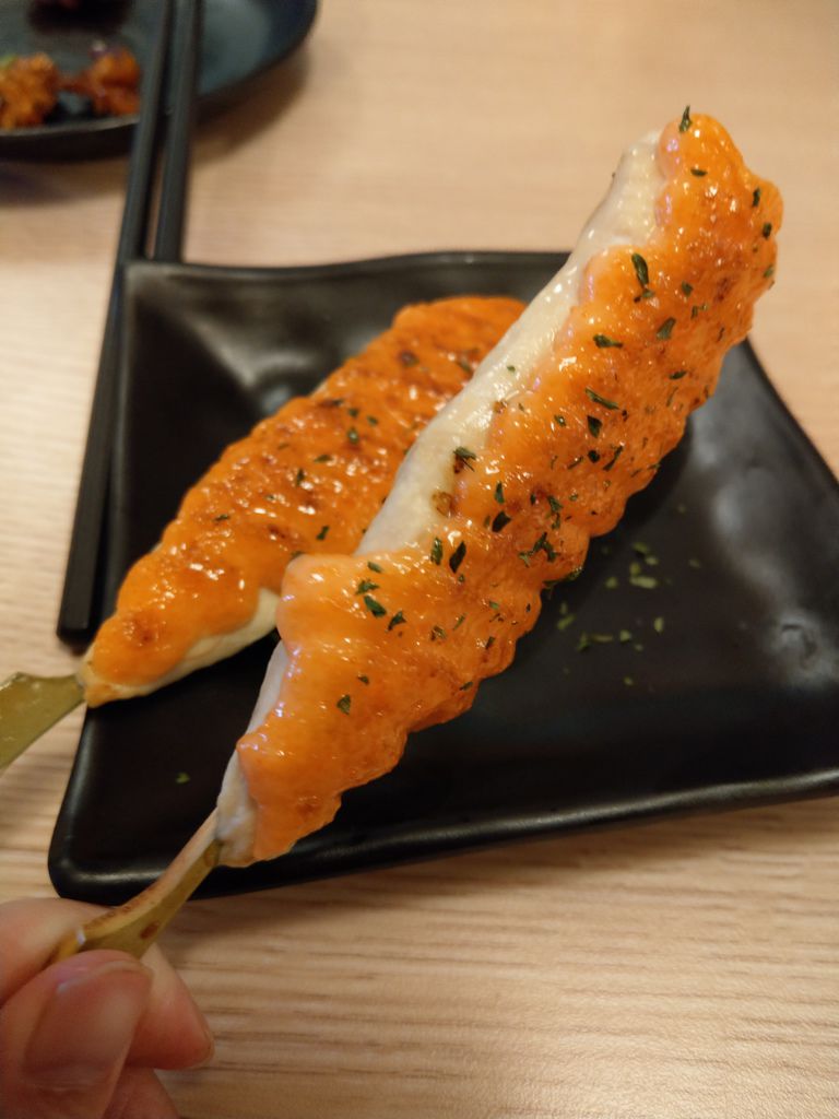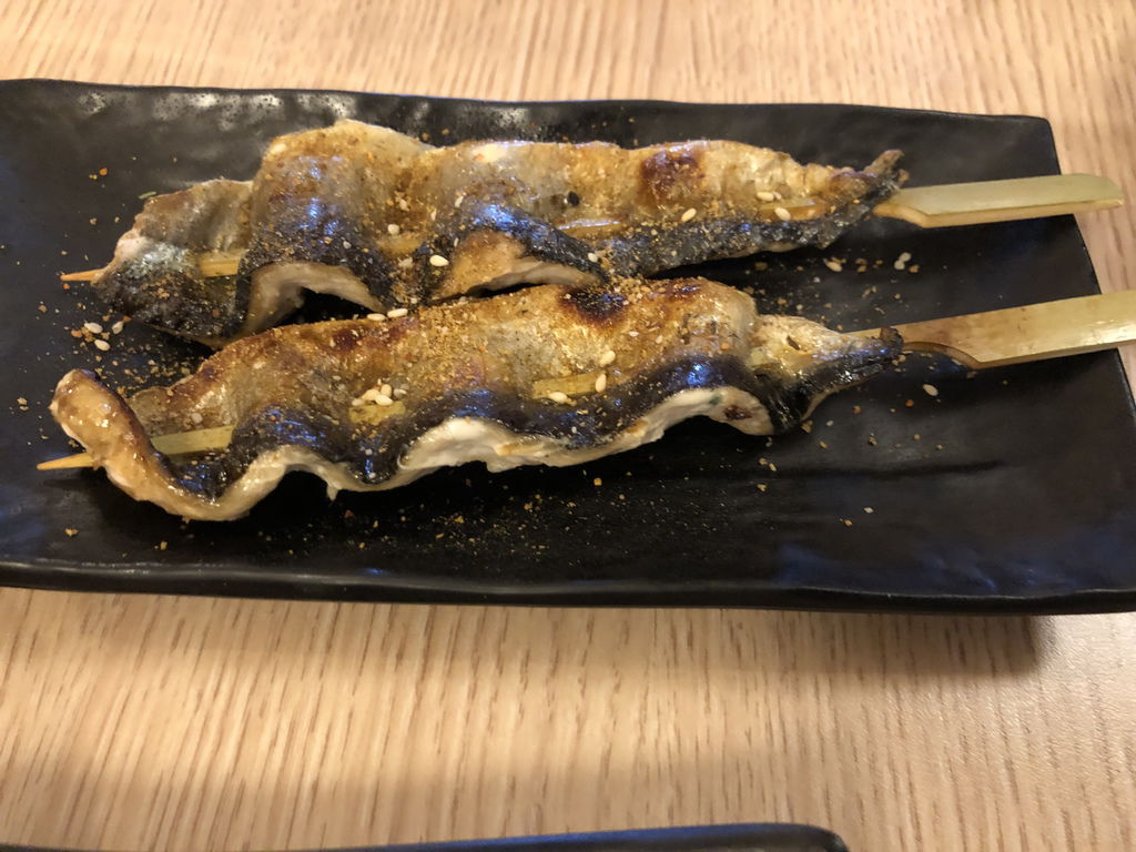 看到這個串燒,心裡還猜想這是甚麼魚。咬下的第一口真的驚嘆連連!!因為秋刀魚營養好吃,但魚肉多刺,內臟難以處理且帶點苦澀味,整隻料理方式居多,每次吃時都十分麻煩,所以看到秋刀魚我總是跳過不吃。沒想到居酒屋能把這秋刀魚處理成這樣,去骨且沒有內藏,只能說它們在食材的處理上真的非常用心。