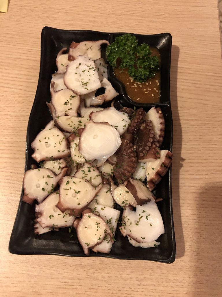 產地直送的新鮮章魚,簡單的處理,搭配五味醬。章魚新鮮Q彈,每一口吃的都是食物的原味。