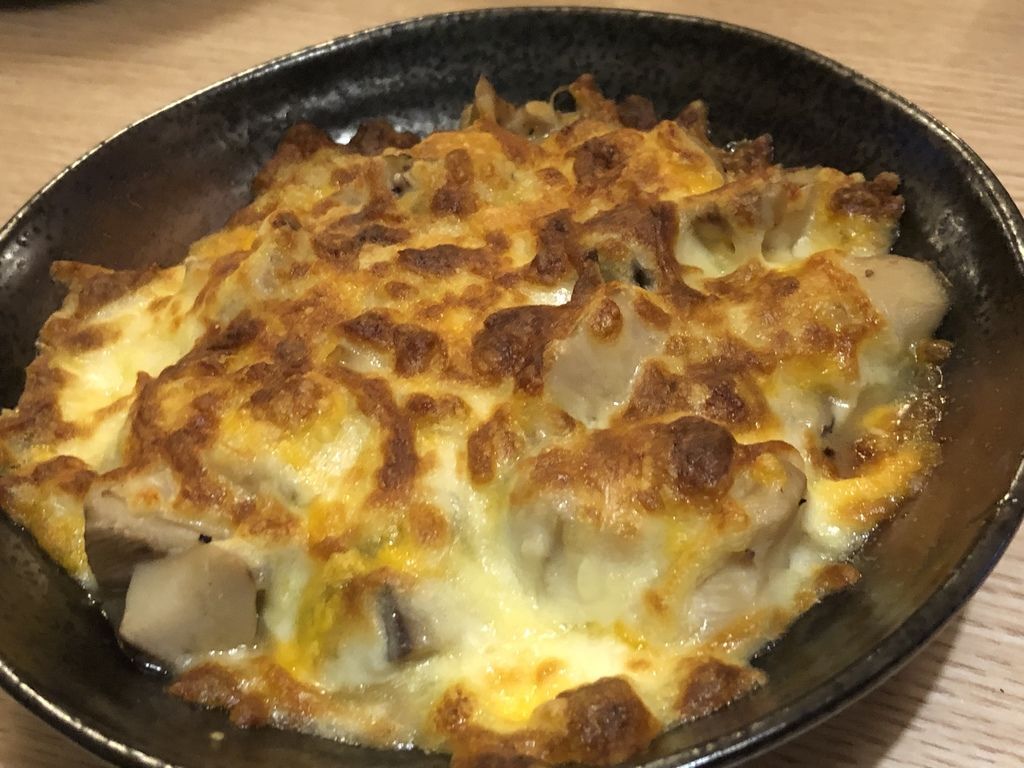 下層的杏鮑菇撲上厚厚一層的起司條在高溫下焗烤,菇類的水分都鎖在裡面,搭配著上層的起司,只能說是一口接一口的好味道,讓人忘記熱量的存在。