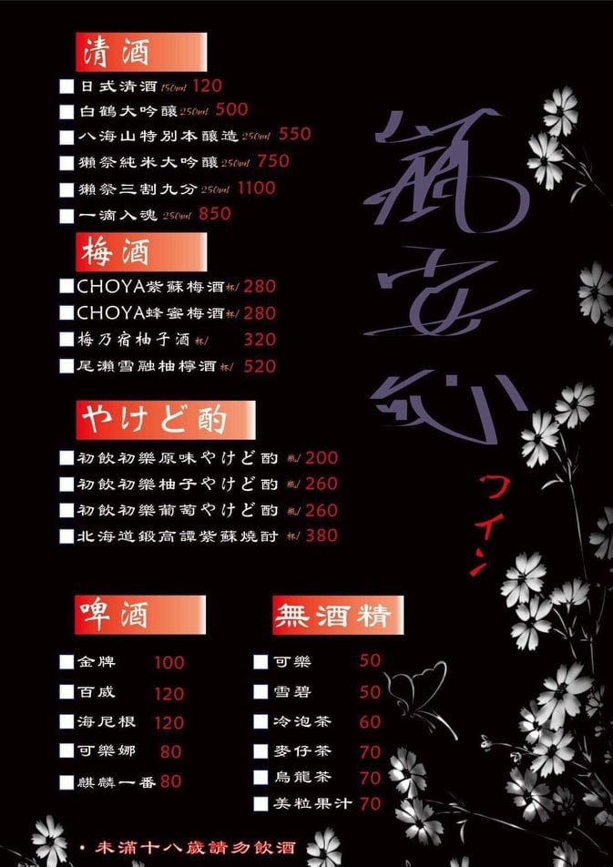 居酒屋的靈魂當然少不了酒類,在此呼籲喝酒後,千千萬萬不要忘記,喝酒勿騎(開)車。