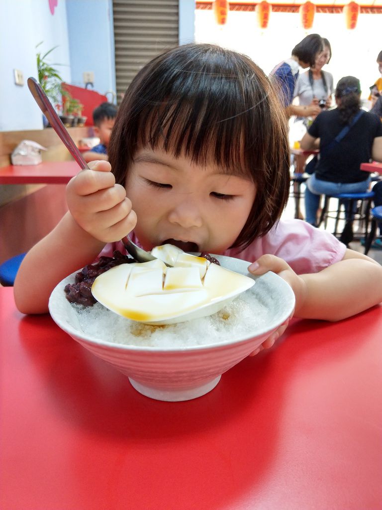 當天挑挑跟多多一直吵著要吃冰,媽媽只好先快速點了這鮮奶豆腐冰+紅豆給他們解解饞。這滑嫩Q彈的豆腐冰,是媽媽來台南才認識的在地甜點。當天點完,媽咪本來想請老闆幫我淋上煉乳(根本就是屬螞蟻的媽媽),但老闆還是建議我們先吃原味,萬一覺得不甜再請他加上煉乳。事實證明老闆是對的,挑挑跟多多單吃原味就超級愛。鮮奶豆腐是老闆嚴選市面上有合格鮮奶標章自己手工製作。雖說叫鮮奶豆腐,但我自己覺得像鮮奶布丁,吃下的每一口都有吃出鮮奶的香甜味。