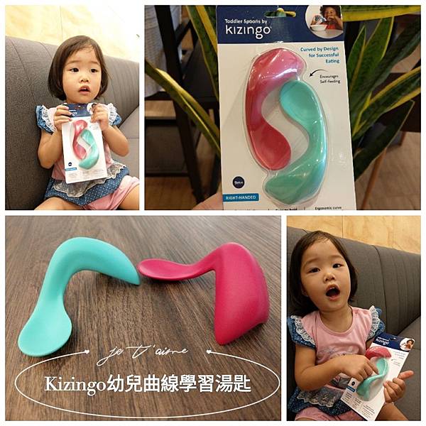 Kizingo幼兒曲線學習湯匙在匙柄方面十分加分,媽咪自己覺得真的厲害。當初看到產品包裝,很怕會有亂花錢的疑慮。彎彎曲曲的曲線,如果不用過真的很難體會到這湯匙創意且許多貼心的設計。請老二-多多(2y4m)先來當小小模特兒來展示(擺弄)。