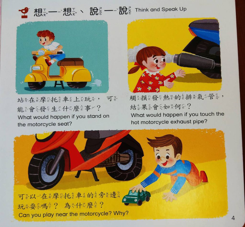 中英文對照除了可以增進媽媽的知識,也可以教導小孩簡單的英文單字。除了簡單的圖卡單字,旁邊對話的互動小知識,也都是中英對照。
