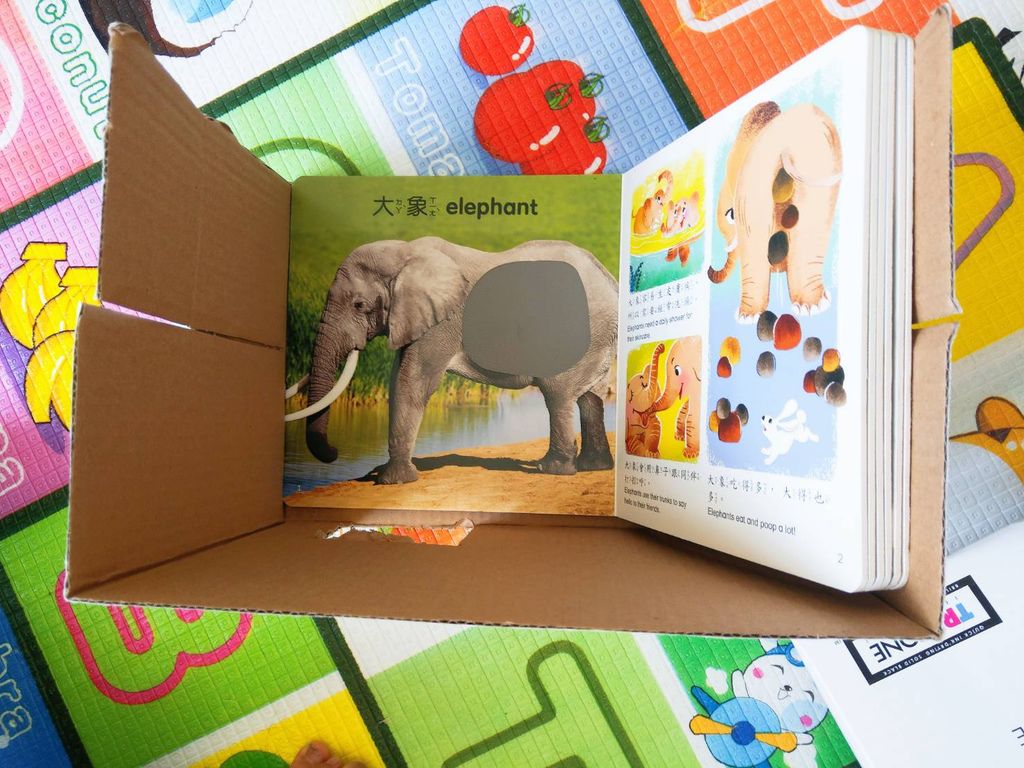 就來個進階版的觸覺小遊戲,我們把書放到箱子裡,來讓小孩藉由觸摸來述說摸到的東西感覺。