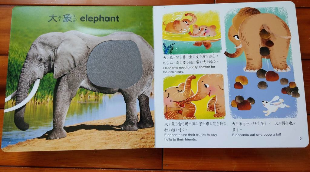 以往媽媽接觸的觸覺書,都著重在再觸摸上。但這本難怪要叫小百科,在每頁的旁邊,都有貼心親子間互動的相關題材,媽媽可以藉著這些小知識,來幫助小閨蜜們增加對書本的知識。