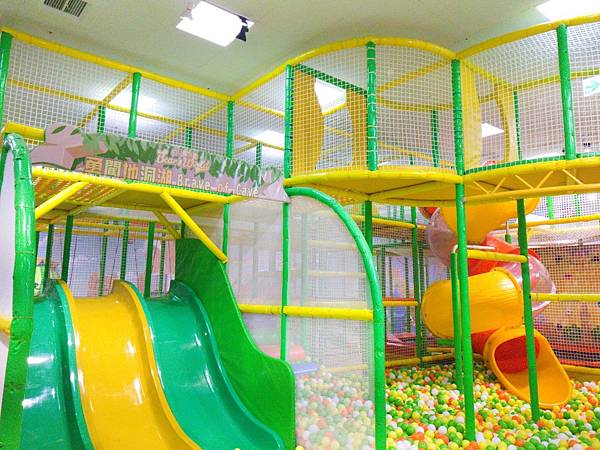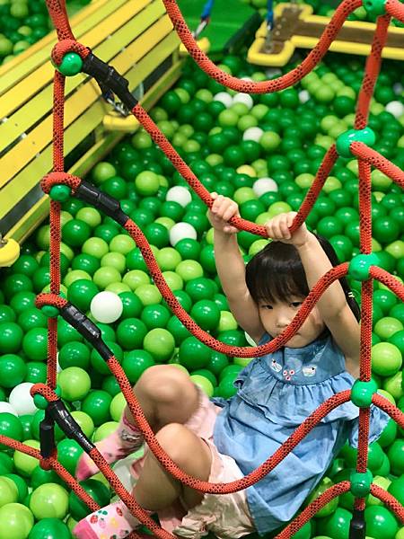 大型的攀爬架,裡面設置了跳床、攀岩、球池及溜滑梯,這裡可是訓練肌力的好地方(希望電力0%)。