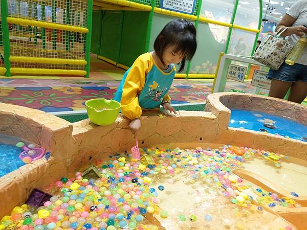 小閨蜜們最愛撈起漂浮在水中的小球,然後把它放在頂端隨著溜滑梯滾下,噗通~跳進水池。