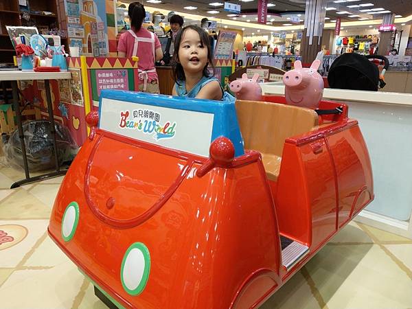 每一個小朋友在進入貝兒絲的時候都可以獲得一枚代幣。投入代幣就可以跟孩子的天王天后(阿奇或佩佩豬),一起搭車遊玩貝兒絲。