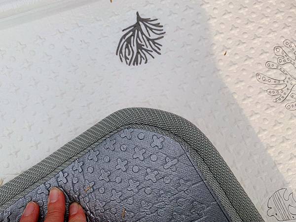 另外地墊厚度雖然1.1cm但整體而言材質還蠻厚實。另外地墊雙面都有立體十字刻紋,更能有效與地面產生摩擦力,小孩再上面蹦蹦跳跳,地墊也不會滑掉。