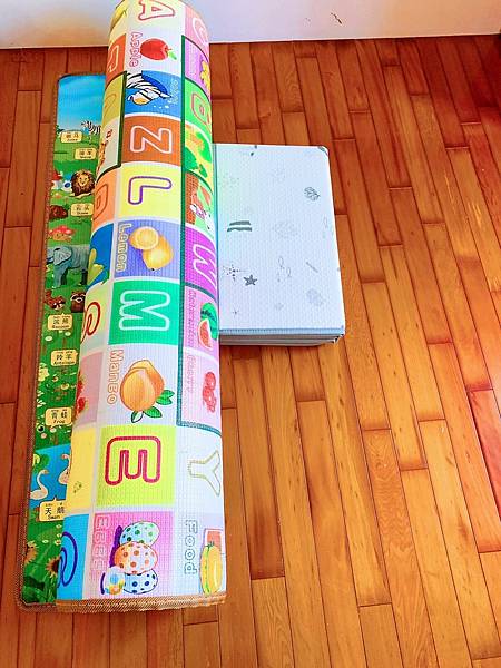 後來聽其他媽媽推薦PVC材質的地毯,但上網作了功課才知道PVC材值的地墊,於製程當中常都添加塑化劑。而寶寶常常在地墊上活動爬行,在把手放到嘴中,這樣無形間也把塑化劑通通吞下肚子。不行!!!寶寶的活動空間就是要無毒,幾番研究後,媽媽就鎖定了PE材質的地墊,上網看過產品後,買了韓國Sobble無毒折疊地墊。