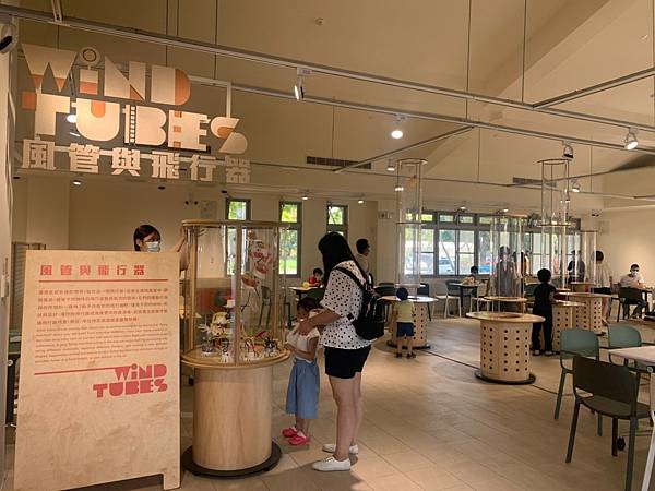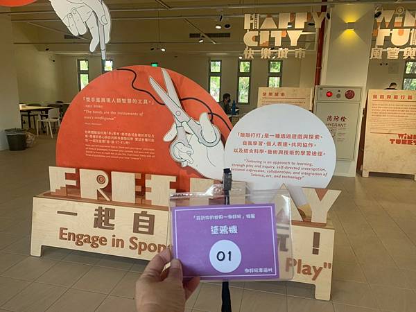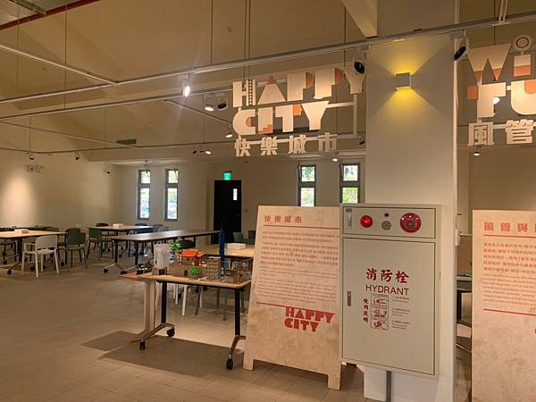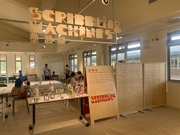 除了共融的遊具外,其實幸福村還有一個「設計我們的世界—潮好玩」特展,這個展分成「小孩館」、「大人館」兩個館。小孩館分成風管與飛行器、塗鴉機、快樂城市。大人館則有我的設計挑戰、與樹共生之坡、手術解決方案、地震緊急救援術,小孩館的項目這些都是利用生活中隨處可見的材料來思考跟設計。