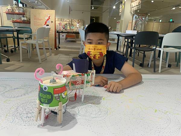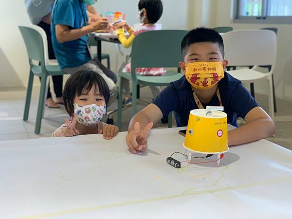 我們這次挑戰的是塗鴉機,真的很好玩,透過回收的紙碗等材料,搭配一個馬達跟畫筆,就可以創造一個塗鴉機。這種動手做的東西,真的沒有想像中的困難,小孩館真的提供了一個很好的場所來給小朋友大膽嘗試,放手創新的好空間。