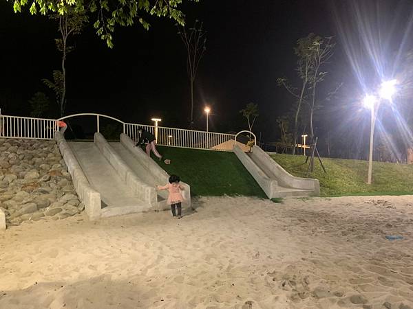 共融公園裡面有原木遊具、七米五雙塔攀爬網、躲貓貓瞭望台溜滑梯、超大沙坑區、磨石子溜滑梯、盪鞦韆、真的很適合小朋友來放風。